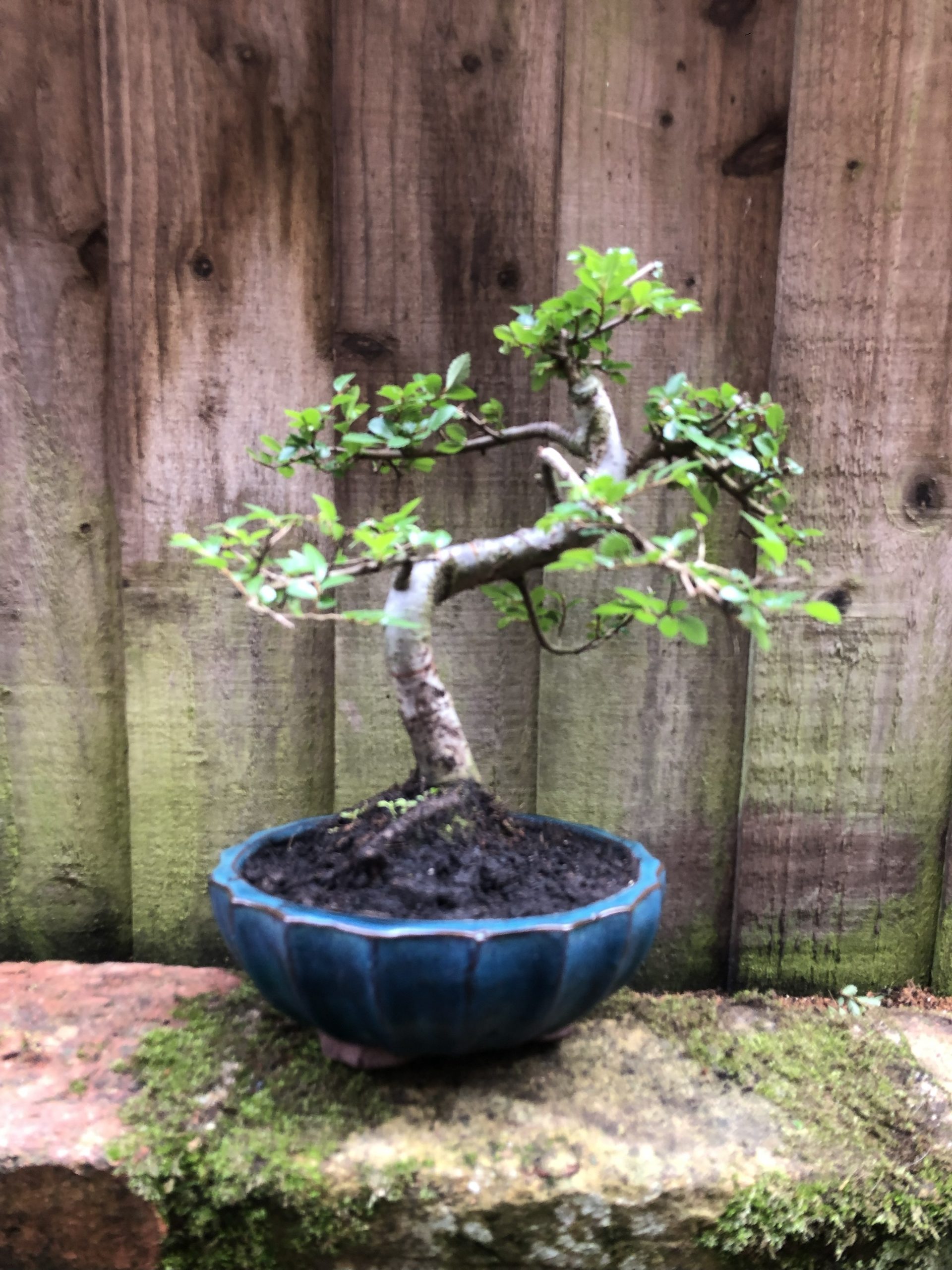 This informal upright shaped Chinese Elm bonsai is the perfect tree for beginners and can be grown indoors in semi shade or full sun outdoors, protect from severe frosts. The tree comes in a turquoise glazed round ceramic bonsai pot.