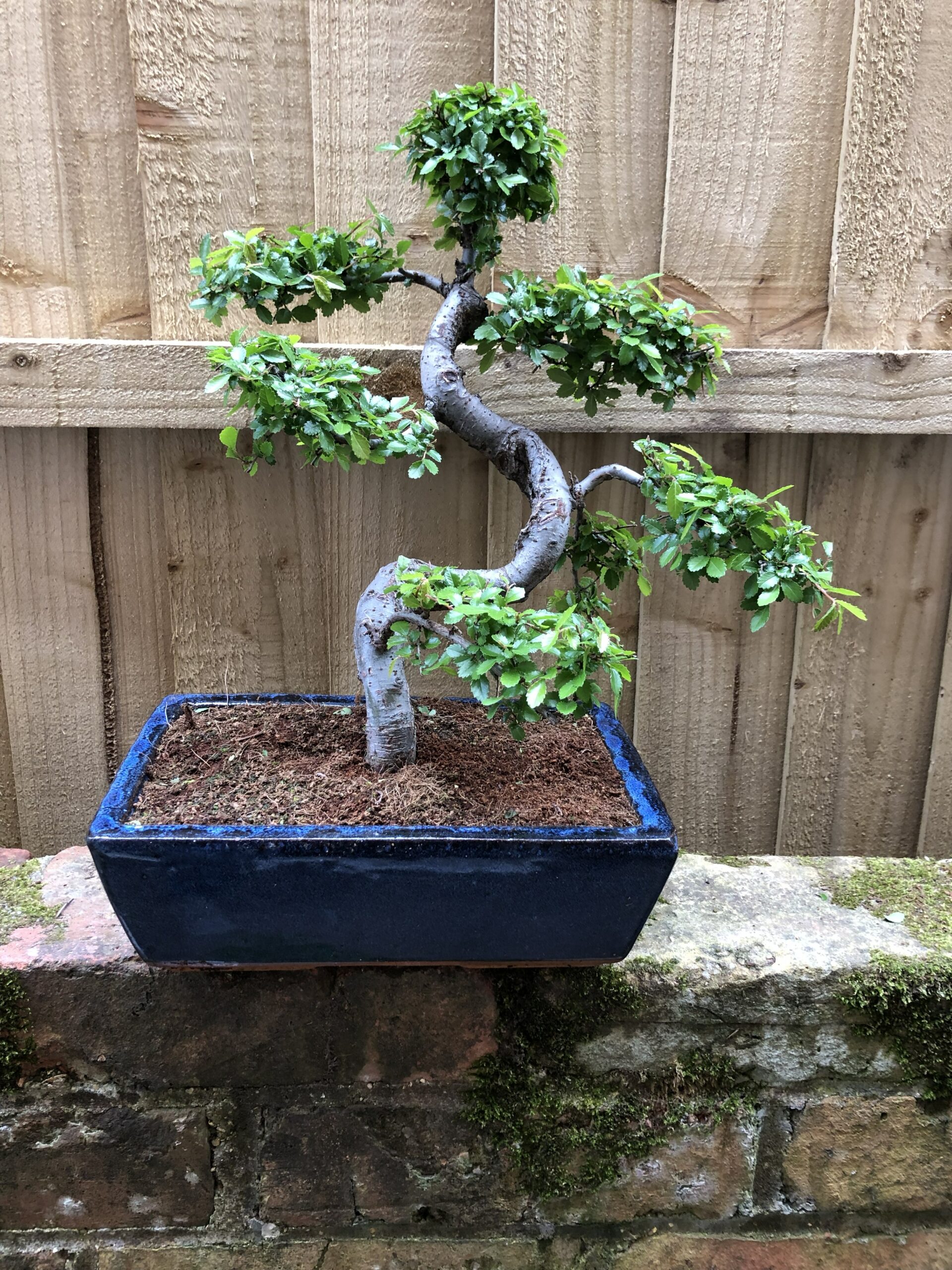 This informal upright shaped Chinese Elm bonsai is the perfect tree for beginners and can be grown indoors in semi shade or full sun outdoors, protect from severe frosts. The tree comes in a blue glazed rectangular ceramic bonsai pot.