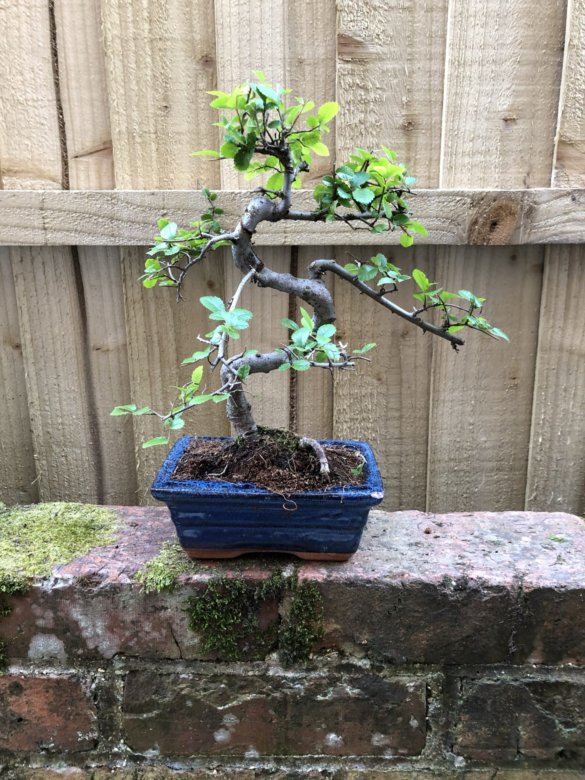 This informal upright shaped Chinese Elm bonsai is the perfect tree for beginners and can be grown indoors in semi shade or full sun outdoors, protect from severe frosts. The tree comes in a blue glazed rectangular ceramic bonsai pot.