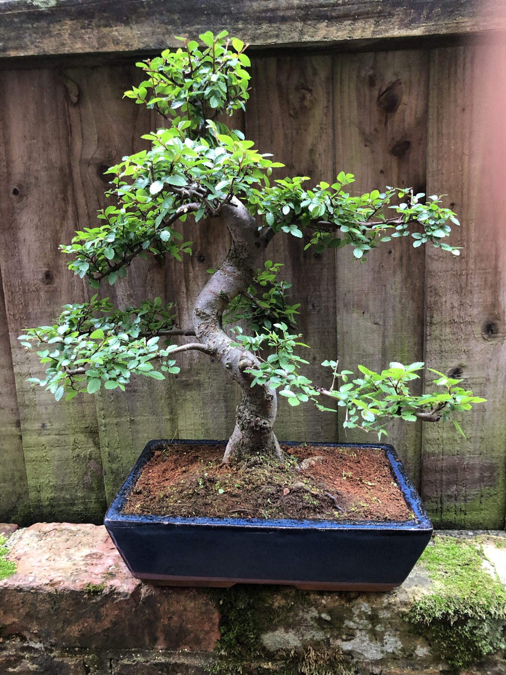 This informal upright shaped Chinese Elm bonsai is the perfect tree for beginners and can be grown indoors in semi shade or full sun outdoors, protect from severe frosts. The tree comes in a blue rectangular ceramic bonsai pot.