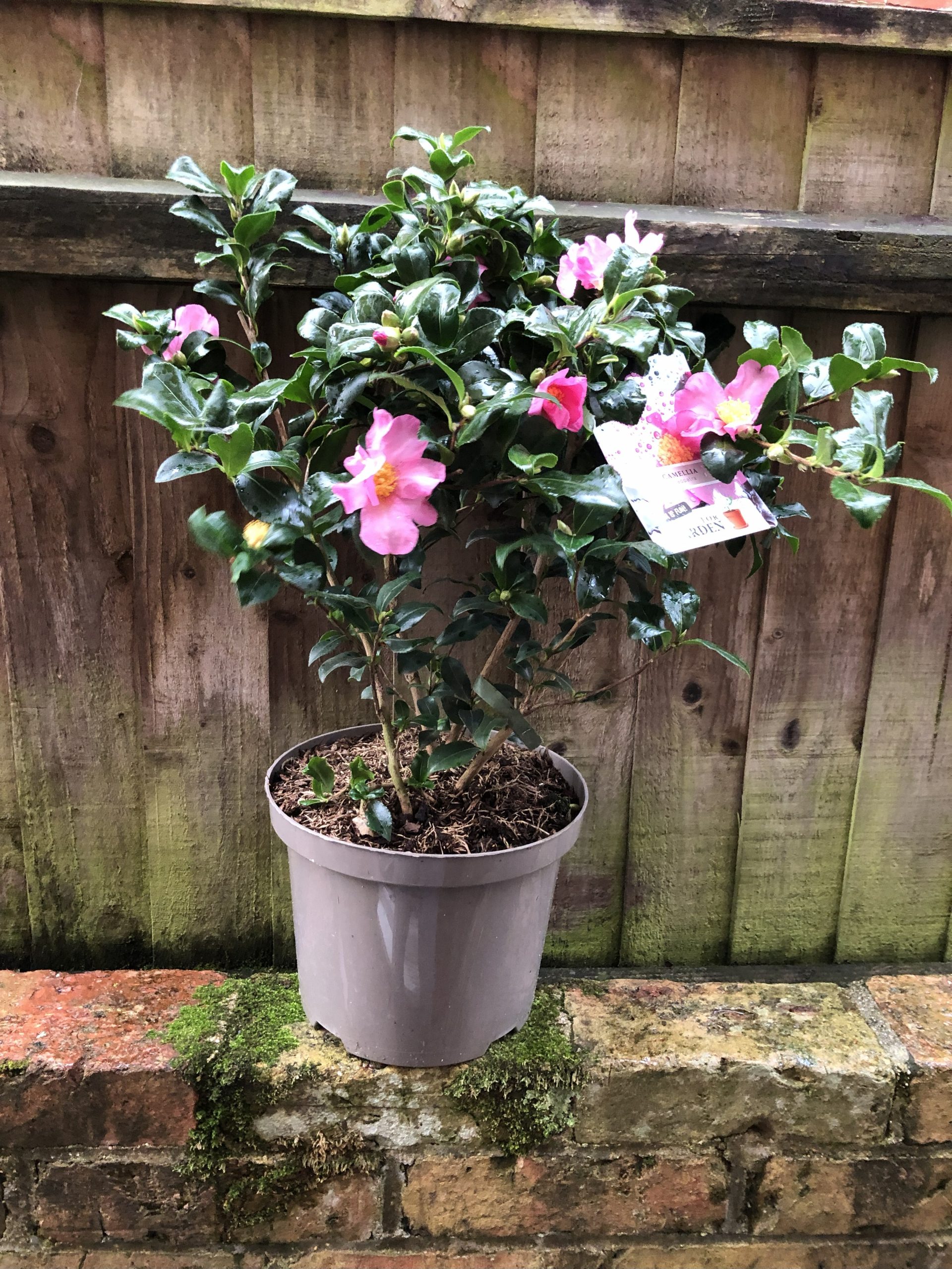 A lovely compact, evergreen shrub with glossy dark green leaves and semi-double rose pink flowers with yellow centres that are produced in autumn and winter.