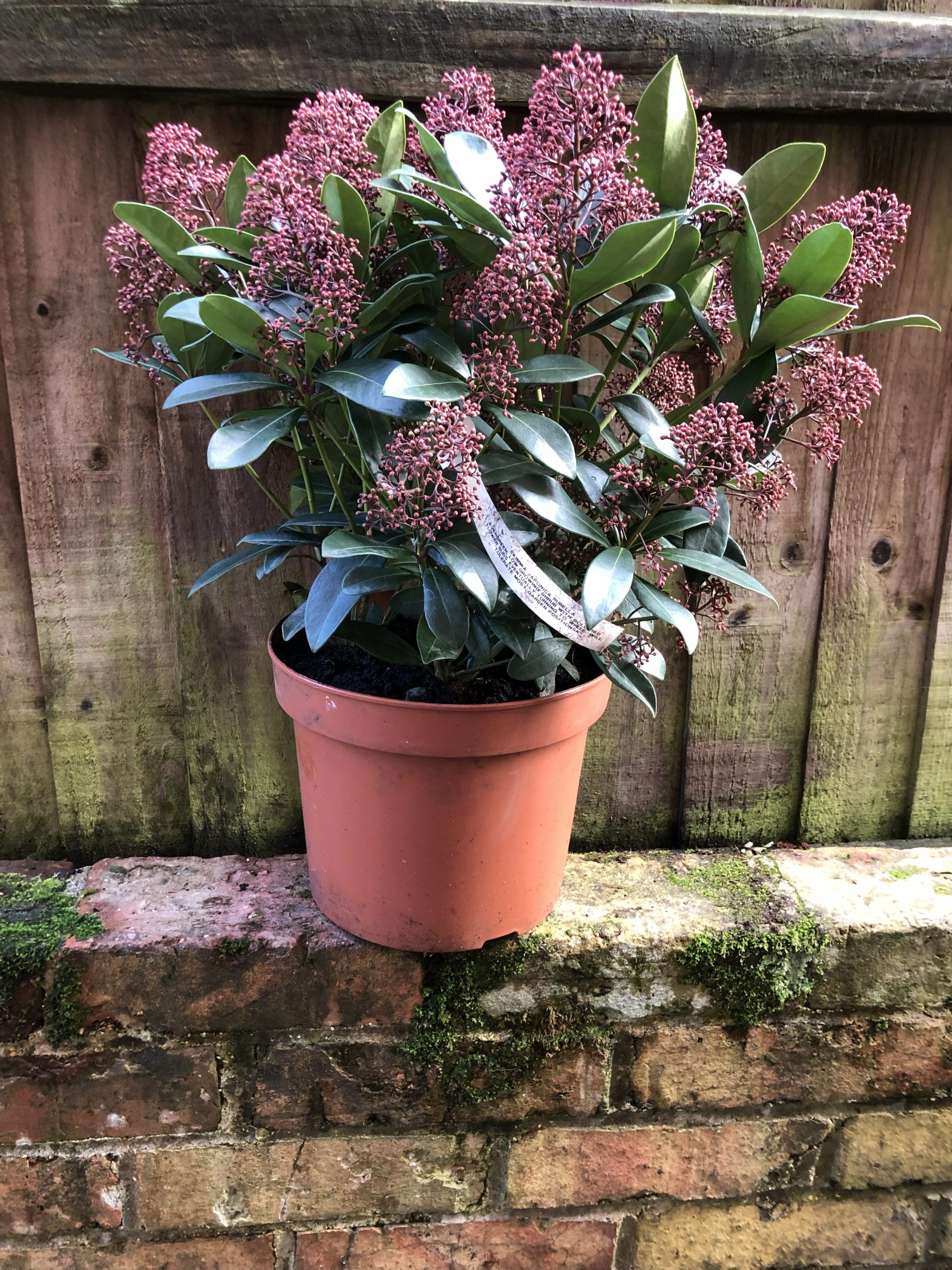 An evergreen perennial plant with glossy green leaves and clusters of creamy white flower buds that appear in the autumn lasting all through the winter until the spring when the buds open with fragrant white flowers.